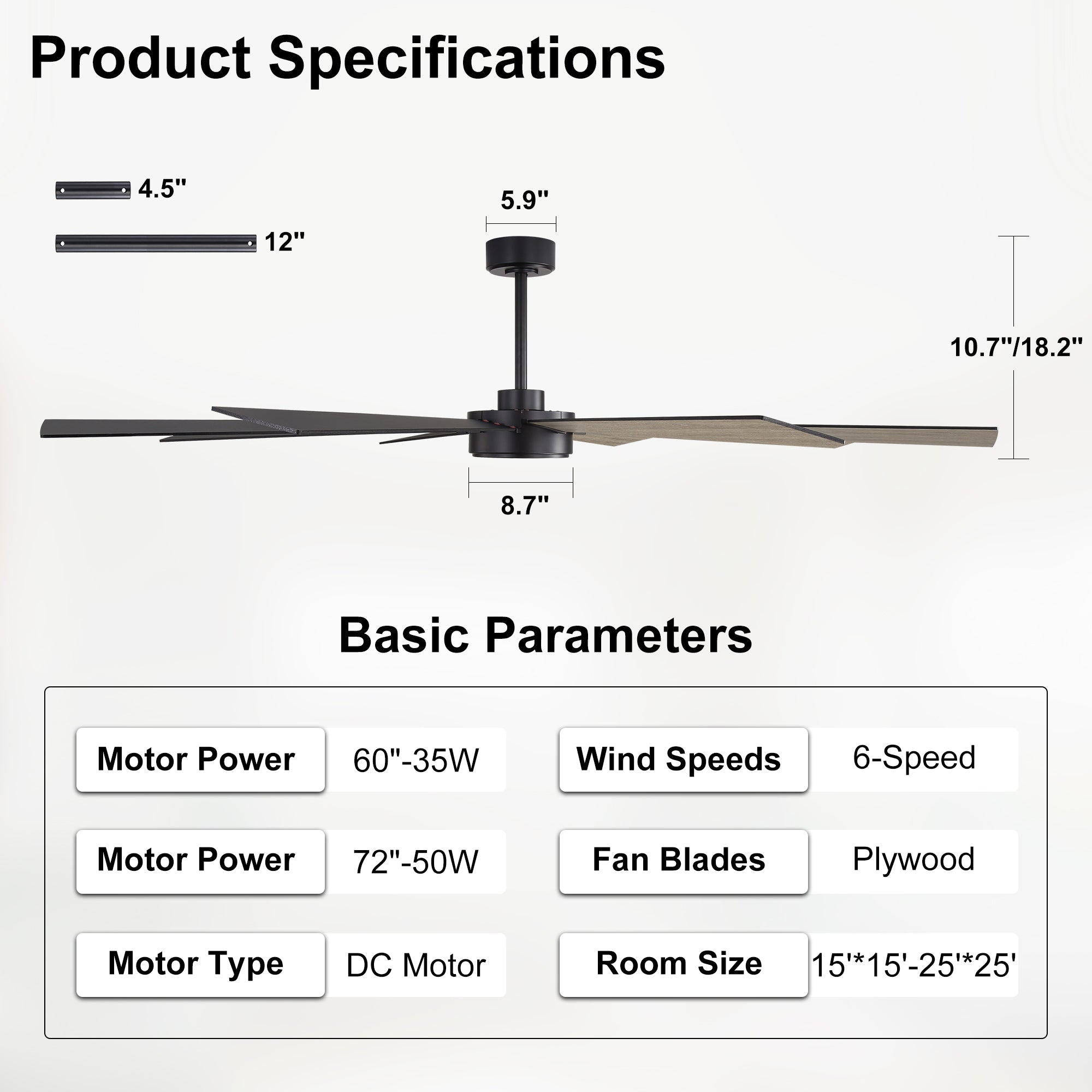 Includes a full-function remote with 6 speeds, forward/reverse, and memory function. Compatible with standard wall switches for simple ON/OFF control.